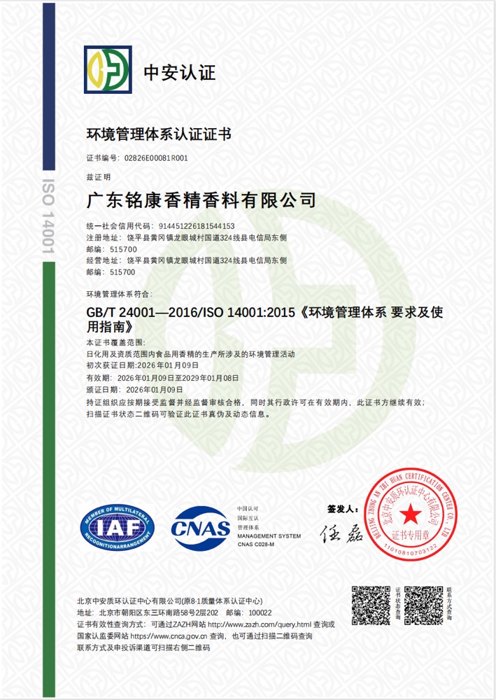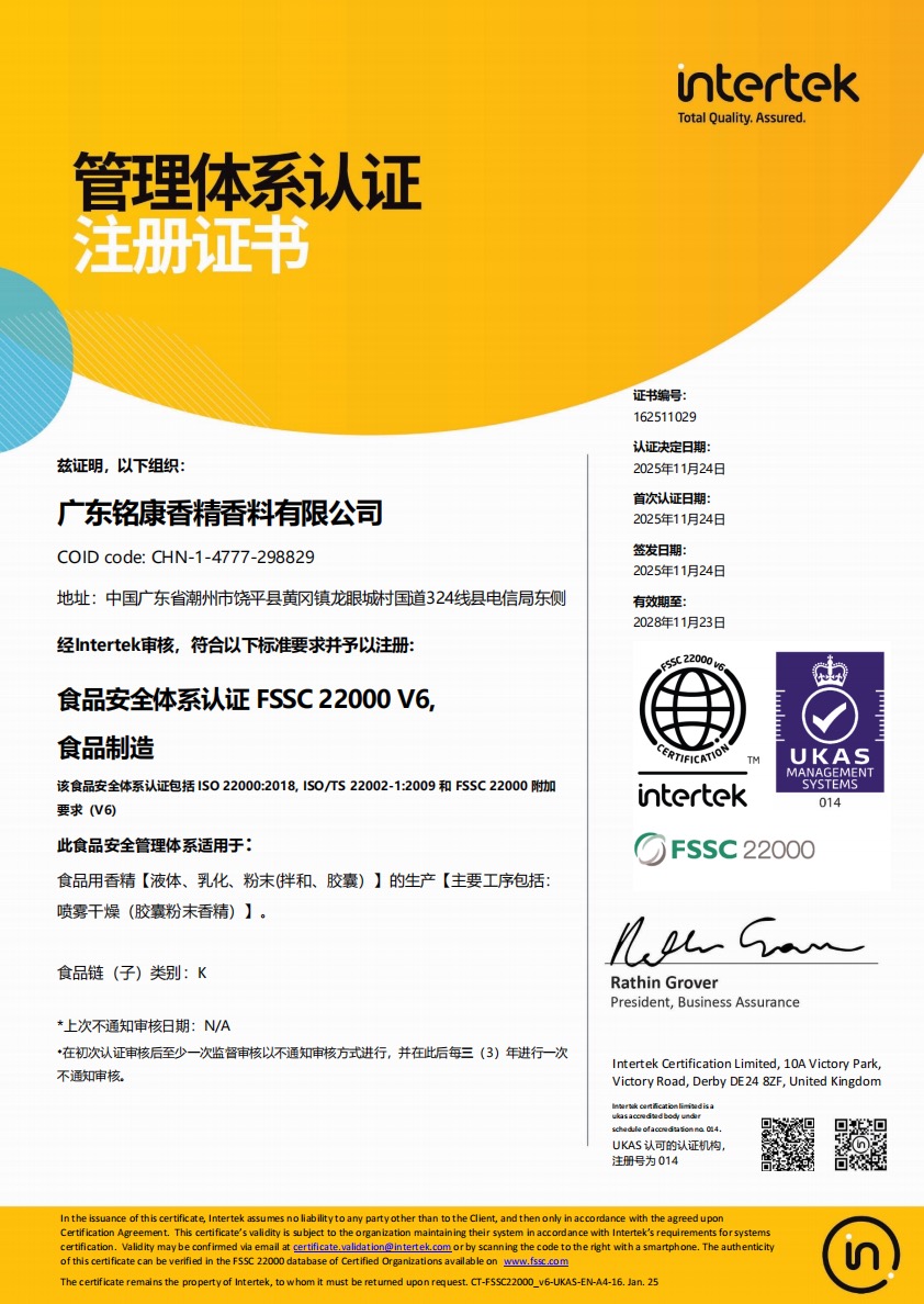 多年来,铭康本着“科学发展、追求卓越”的企业宗旨,秉承“携手共进、诚信共赢”的经营理念,历经二十余载的不懈努力,已发展成为在中国香料香精行业知名度高、创新能力强、影响力大的品牌企业,历任“中国香精香料化妆品工业协会副理事长单位”、“香精专业委员会副主任委员单位”、“香料香精法规事务工作委员会副主任单位”、“科技工作委员会副主任委员单位”,是国家标准《日用香精GB/T22731-2017》主要起草单位,连续多年被评为中国香精香料行业十强企业。